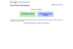 Google vient de mettre en ligne un moteur de recherche pour les victimes à Haïti. une initiative citoyenne experimentale qu’il faut suivre de près. Google a mis en ligne deux petits outils destinés, l’un, à donner des nouvelles d’une personne présente lors du tremblement de terre et l’ autre pour chercher une personne dont on est sans nouvelles.