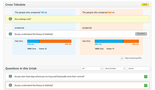 Urtak permet ainsi de savoir ce que les autres pensent mais aussi de poser des questions auxquelles on aurait peut être pas pensé. Les gens aiment donner leur opinion et avec Urtak c’est encore plus simple de le faire : Oui, non, ça ne m’intéresse pas.
